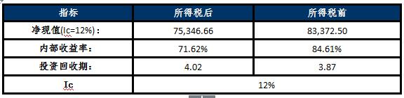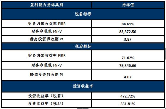 經(jīng)測(cè)算,項(xiàng)目稅前內(nèi)部收益率為84.61%,財(cái)務(wù)凈現(xiàn)值為83,372.50萬(wàn)元,靜態(tài)投資回收周期為3.87年;稅后內(nèi)部收益率為71.62%,財(cái)務(wù)凈現(xiàn)值為75,346.66萬(wàn)元,靜態(tài)投資回收周期為4.02年;項(xiàng)目稅前投資收益率為427.72%;稅后投資收益率為351.81%。