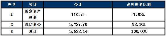 項(xiàng)目一期總投資5,838.44萬(wàn)元,其中固定資產(chǎn)110.74萬(wàn)元,流動(dòng)資金5,727.70萬(wàn)元。