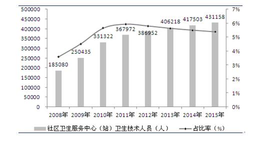 圖表2:2008-2015年全國社區(qū)衛(wèi)生服務(wù)中心(站)占衛(wèi)生技術(shù)人員比例(單位:人,%)