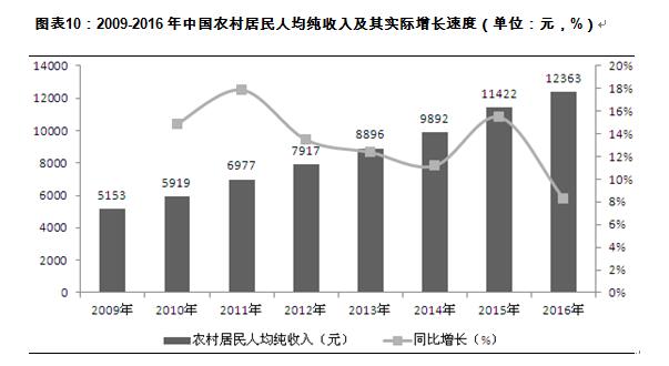 2016年全國居民人均可支配收入23821元,比上年增長8.4%,扣除價格因素,實際增長6.3%;全國居民人均可支配收入中位數(shù)20883元,增長8.3%。2016年,農(nóng)村居民人均可支配收入12363元,比上年增長8.2%,扣除價格因素,實際增長6.2%;農(nóng)村居民人均可支配收入中位數(shù)11149元,增長8.3%。城鎮(zhèn)居民人均可支配收入33616元,比上年增長7.8%,扣除價格因素,實際增長5.6%;城鎮(zhèn)居民人均可支配收入中位數(shù)31554元,增長8.3%